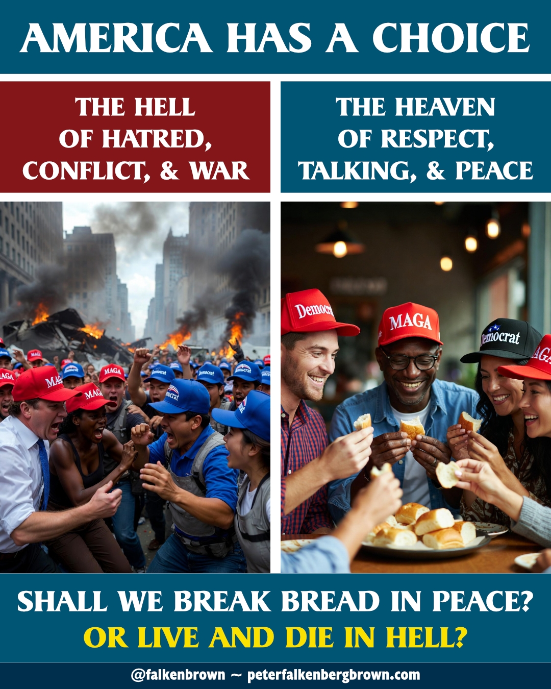 MEME: America Has A Choice: Shall We Break Bread In Peace? Or Live And Die In Hell? Feb 1, 2026 The meme may be downloaded and distributed freely as long as it remains intact. Just right click and save the image.